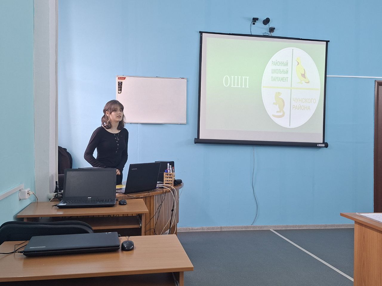 Ведущий специалист по методической деятельности ЦРО Наталья Анатольевна Рукосуева и председатель ОШП выпускница школы №29 р.п. Чунский Полина Криль рассказали педагогам о роли школьного самоуправления, методах его работы, а также объяснили отличия от организации «Движение Первых».